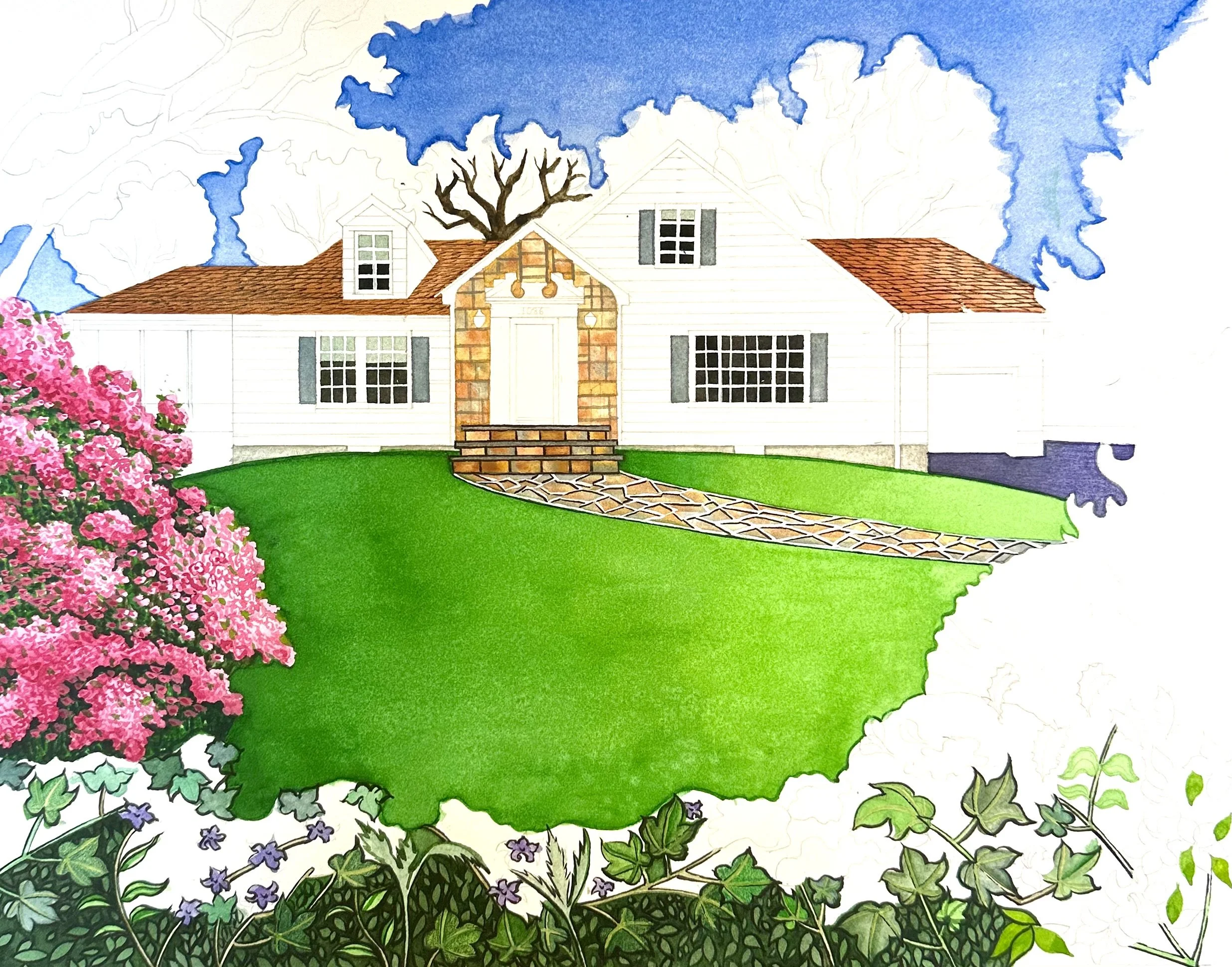This Watercolor House Portrait was created by Jennifer Skopp to be a closing gift from a pair of realtors to give to their client, who was selling her house in Mountainside, NJ.